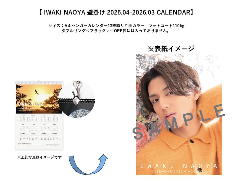 ◎販売開始 2025年4月11日(金)12時〜 ◎発送時期 ご注文から5営業日以内に発送いたします。(土日祝を除く平日5日以内) ※無くなり次第、終了となります。 ※購入個数制限はございません。 ※1度のご注文で他作品のイベントグッズを合わせてご購入いただくことは可能ですが、ご注文いただいた中で「最も遅い時期」の発送商品に合わせて、全てのグッズを発送いたします。 ◎ご注文時のご注意 『IWAKI NAOYA 卓上 2025.04-2026.03 CALENDAR』におきまして、一部に誤植がございます。 こちらは商品不良の対象外となります為、予めご了承の程宜しくお願い申し上げます。 以下発売元様からのご案内となります。 ----- 『IWAKI NAOYA 卓上 2025.04-2026.03 CALENDAR』におきまして、一部に誤植がありました。 大変ご迷惑をおかけいたしますこと深くお詫び申し上げます。 対象商品:『IWAKI NAOYA 卓上 2025.04-2026.03 CALENDAR』 【誤植内容】 4月2ページ目 4/16の下のスペル間違い 先日のイベント時にご購入いただいたお客様には個々に説明させていただいております。 お客様には多大なご迷惑をおかけすることとなり、誠に申し訳ございません。 深くお詫び申し上げますとともに、今後更に十分に注意して商品制作に当たる所存でございますので、 引き続き岩城直弥関連商品をご愛顧賜りますようお願い申し上げます。 ----- <商品ラインナップ>